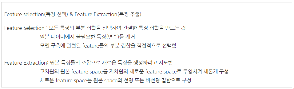 앞서 언급했던 특징선택과 특징 추출의 차이점을 간단하게 정리해봤습니다.