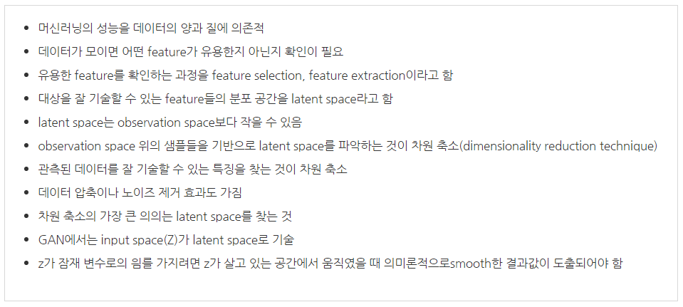 우리가 훈련에 필요한 충분한 고차원의 입력 값을 가지고 있다고 가정해 봅시다. 모든 개수의 fearture가 필요하지 않을 수도 있고, 가지고 있는 feature들 중 몇몇 개는 다른 특징들의 조합으로 표현 가능하므로 불필요할 수도 있습니다. 따라서 관찰 대상들을 잘 설명할 수 있는 잠재 공간(latent space)은 실제 관찰 공간(observation space) 보다 작을 수 있습니다. 이렇게 관찰 공간 위의 샘플 기반으로 잠재 공간을 파악하는 것을 차원 축소(dimensionality reduction technique)라고 합니다.