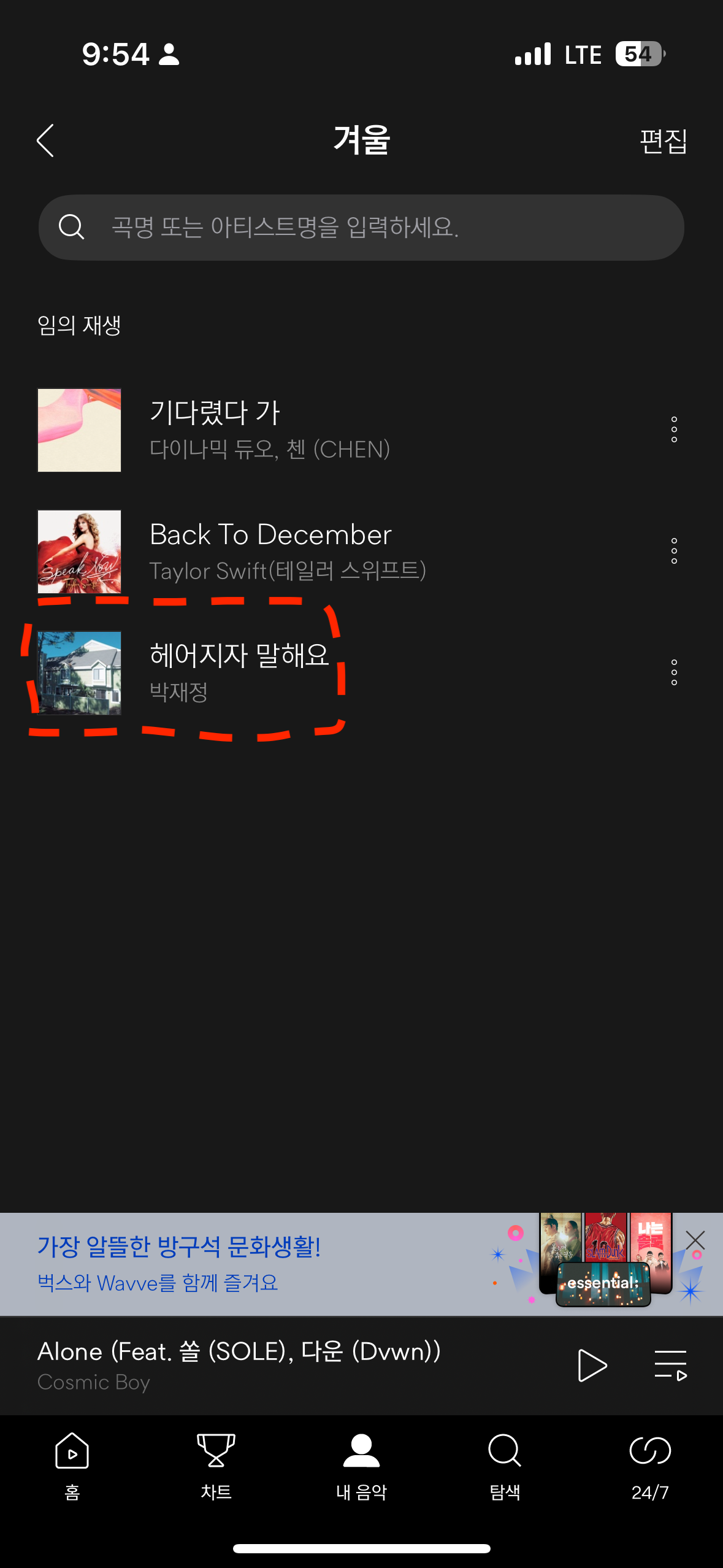 노래가 듣고 싶으면 유튜브 뮤직에서 아무 노래 하나만 누르면 끝이다.