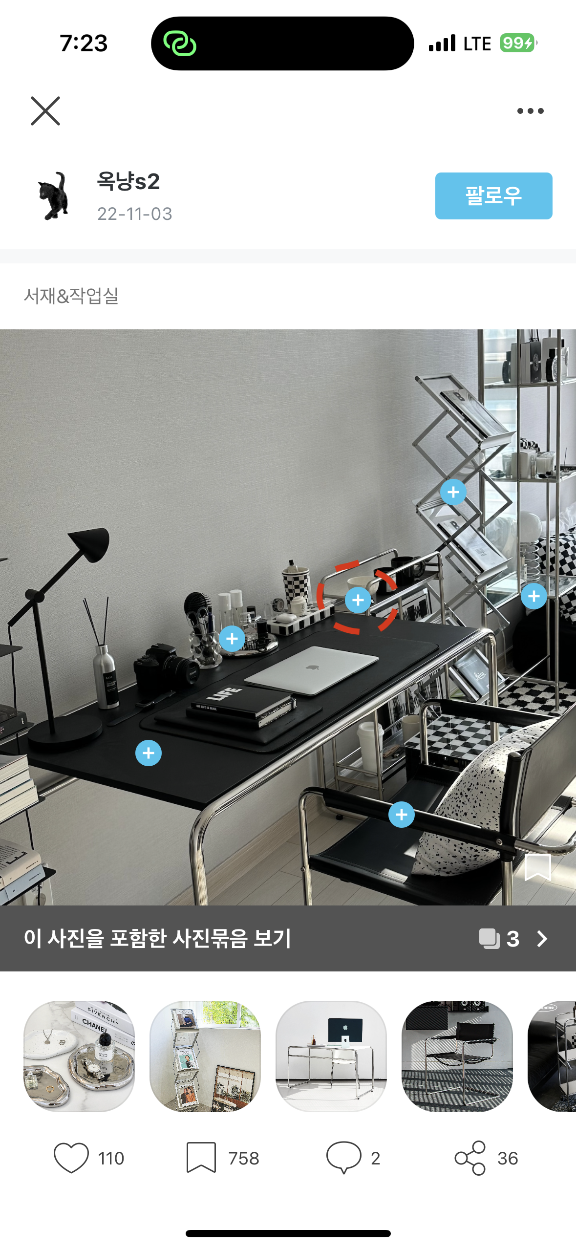 - 콘텐츠 내의 제품 태그(+)를 클릭하면 제품 상세 화면으로 넘어가 제품을 상세 정보를 볼 수 있고, 바로 구매도 가능한 one-stop 구매 시스템을 제공