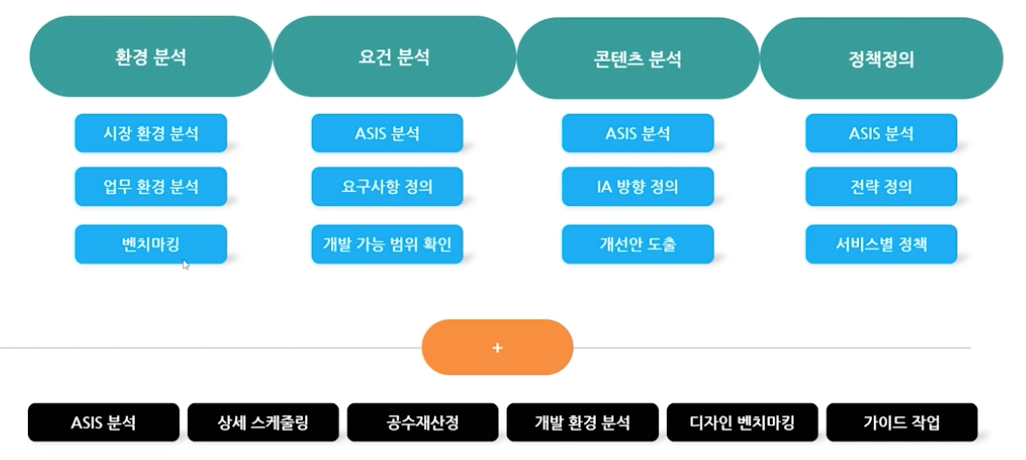 기획자의 업무: 환경 분석, 요건 분석, 콘텐츠 분석, 정책 정의, 가이드 정의