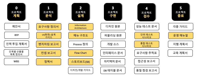 - 단계별로 정해진 산출물이 정해져 있으며, 산출물이 모두 도출되어야 한다.