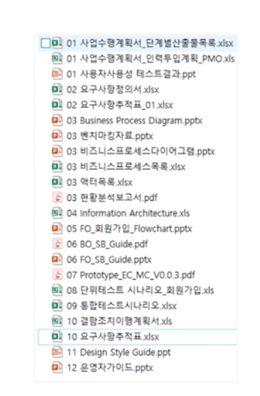 - 산출물에 대한 규칙(프로젝트 넘버링) 정의가 매우 중요하다. **정리정돈 필수!