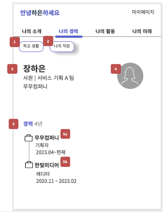 다음 화면은 나의 경력 중 나의 직장 와이어프레임이다. 학교 생활과 나의 직장을 각각 상단 버튼을 통해 이동할 수 있으며,