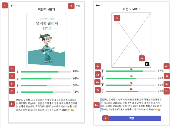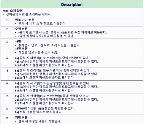 다음은 MBTI를 소개하는 화면 와이어프레임이다. 사진과 함께 MBTI와 관련된 '나'의 성격을 소개할 수 있는 글귀를 제공하도록 구성했다.