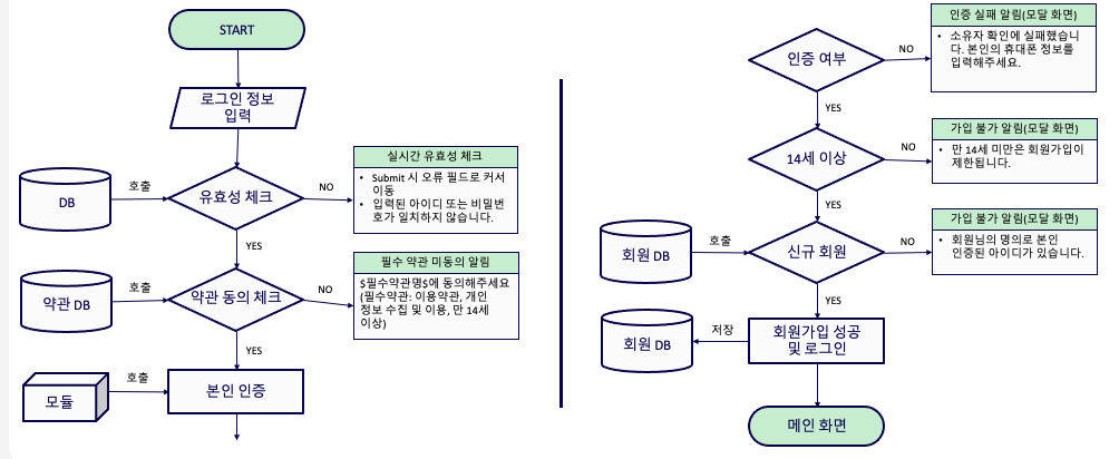 플로우차트에서는 크게 회원가입 시 작동되는 플로우와 데이터베이스 간 흐름 등을 고려한 BO와 관리자인 '나'를 특정하기 위한 플로우를 작성했다.