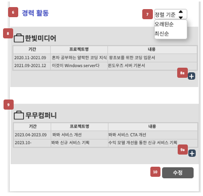 나의 직장에서는 '나'의 경력 활동에 대한 내용을 보다 자세히 보여줄 수 있도록 구성했다. 또한 관리자(나)는 가장 하단의 노출된 수정 버튼으로 해당 화면의 내용을 수정할 수 있도록 구성했다.