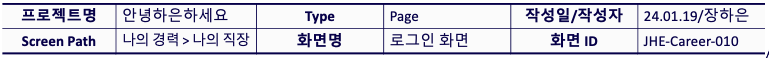 다음 화면은 나의 경력 중 나의 직장 와이어프레임이다. 학교 생활과 나의 직장을 각각 상단 버튼을 통해 이동할 수 있으며,