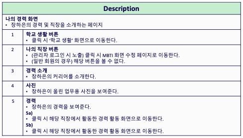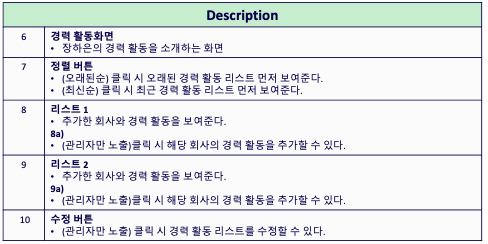 나의 직장에서는 '나'의 경력 활동에 대한 내용을 보다 자세히 보여줄 수 있도록 구성했다. 또한 관리자(나)는 가장 하단의 노출된 수정 버튼으로 해당 화면의 내용을 수정할 수 있도록 구성했다.
