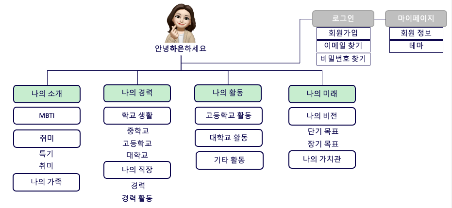 나를 소개하는 서비스다보니 많은 화면을 세분화하기보다 간결하고 명확한 구조로 쉽게 파악할 수 있도록 구성했다.