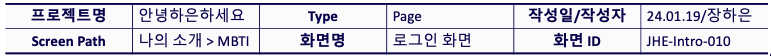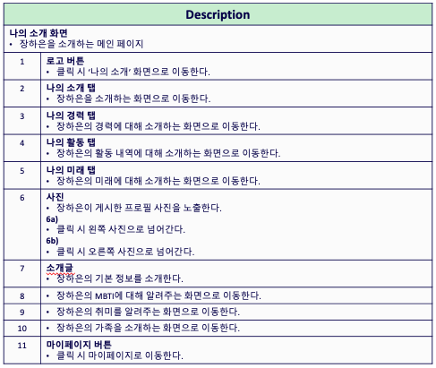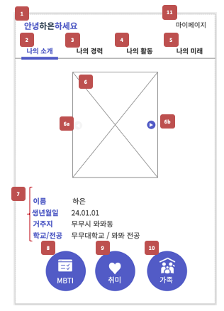 다음은 MBTI를 소개하는 화면 와이어프레임이다. 사진과 함께 MBTI와 관련된 '나'의 성격을 소개할 수 있는 글귀를 제공하도록 구성했다.