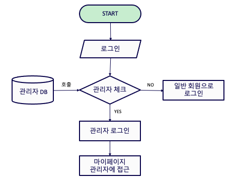 플로우차트에서는 크게 회원가입 시 작동되는 플로우와 데이터베이스 간 흐름 등을 고려한 BO와 관리자인 '나'를 특정하기 위한 플로우를 작성했다.