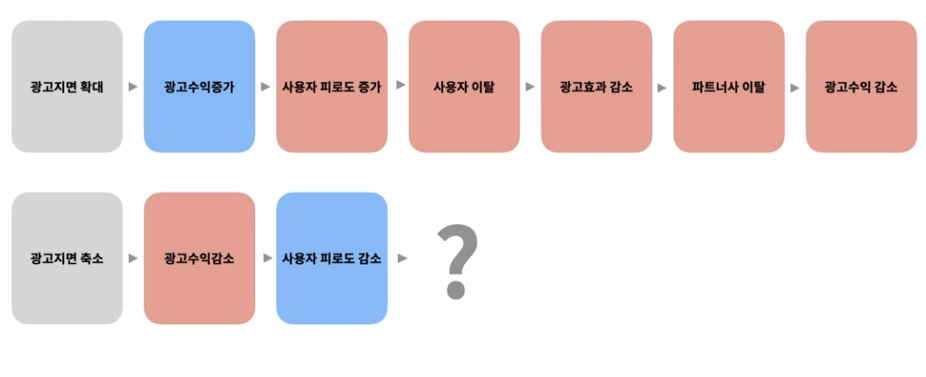 - 광고 수익 증대 → 사용자 피로도 증가 → 사용자 이탈 → 광고 효과 감소 → 파트너사 이탈 → 광고 수익 감소