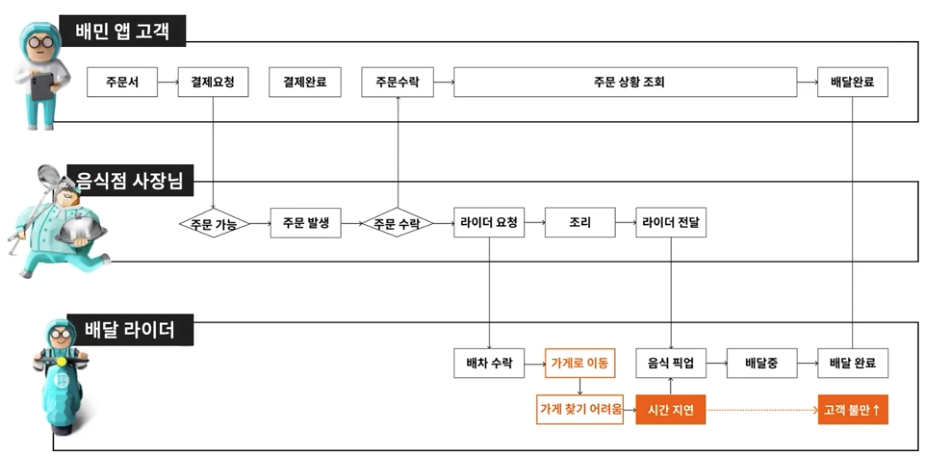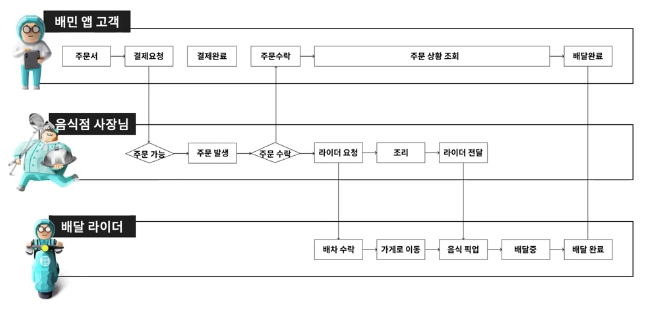 고객: 주문 → 결제 요청 → 결제 완료 → 주문 수락 → 주문 사항 조회 → 배달 완료