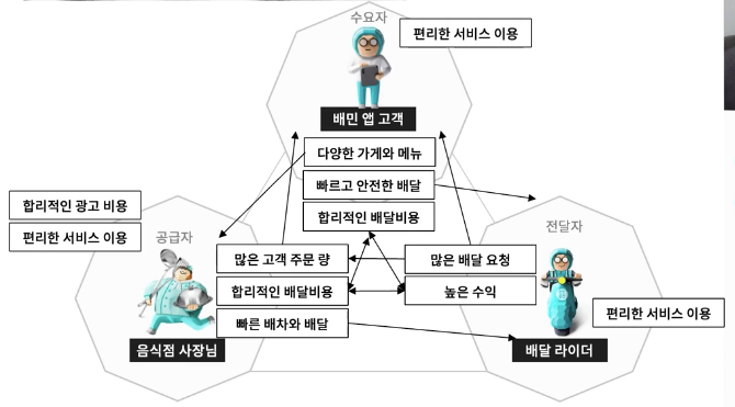 음식을 주문하는 고객과 음식점 사장님 간의 주문을 연결해 주고 라이더가 음식을 받아 고객에게 전달하는 다면 시장 구조