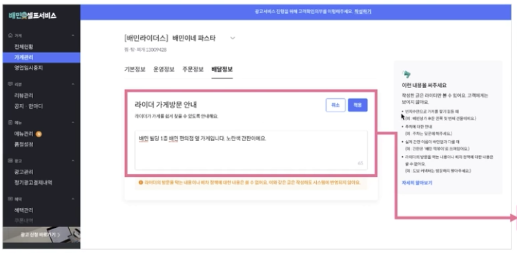 - 가게 사장님이 직접 입력할 수 있도록 사장님 이용 서비스인 배민 외식업 광장 셀프서비스 페이지에 '라이더 가게 방문 안내' 문구를 입력할 수 있도록 기능 확장